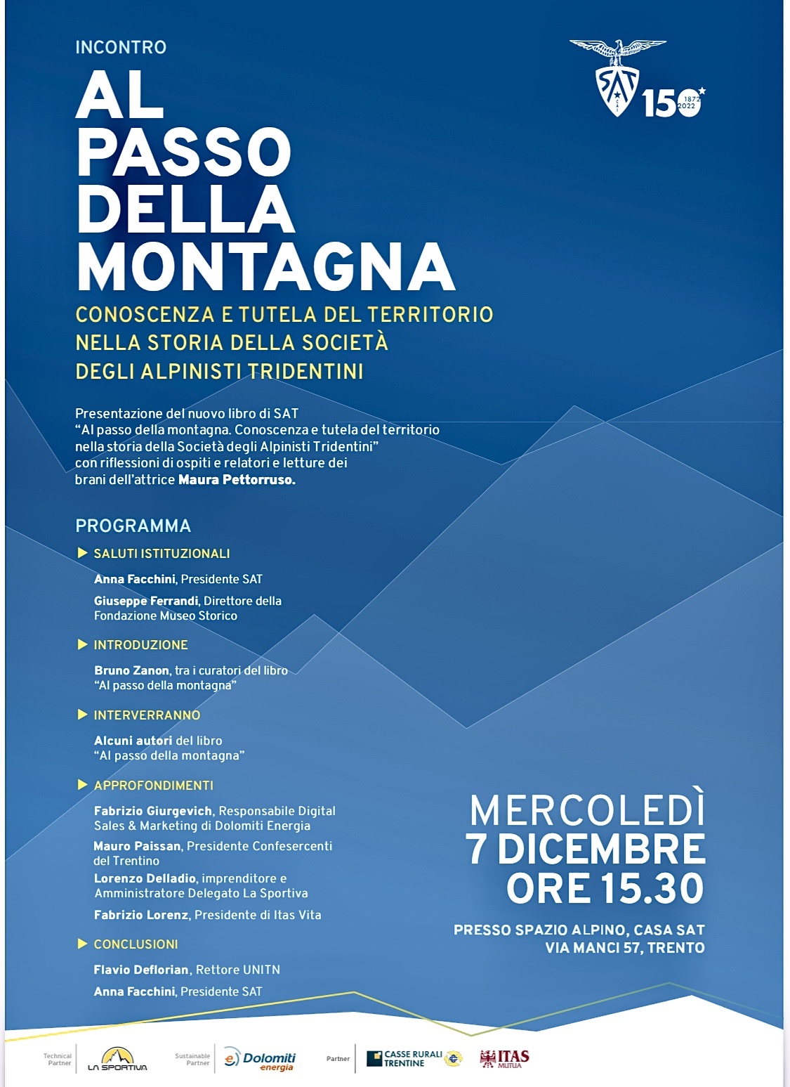 Hanno partecipato all’evento di presentazione della nuova pubblicazione di SAT, Anna Facchini, presidente della SAT, Claudio Ambrosi (uno dei curatori del libro),  direttore della SAT,  Giuseppe Ferrandi, direttore della Fondazione Museo Storico del Trentino, Flavio Deflorian, magnifico rettore dell’ Università di Trento, Bruno Zanon, uno dei curatori del libero ed alcuni degli autori di questa nuova pubblicazione.